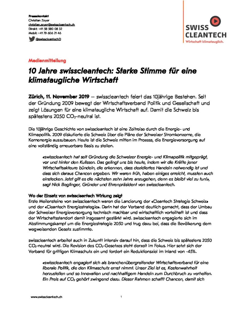 «swisscleantech hat seit Gründung die Schweizer Energie- und Klimapolitik mitgeprägt, vor und hinter den Kulissen. Das gelingt uns bis heute, indem wir die Kräfte jener Wirtschaftsakteure bündeln, die erkennen, dass dezidiertes Handeln notwendig ist und dass sich daraus Chancen ergeben. Wir waren früh, haben einiges erreicht, mussten auch einstecken. Jetzt gilt es die nächsten zehn Jahre anzugehen, denn es bleibt viel zu tun!», sagt Nick Beglinger, Gründer und Ehrenpräsident von swisscleantech.