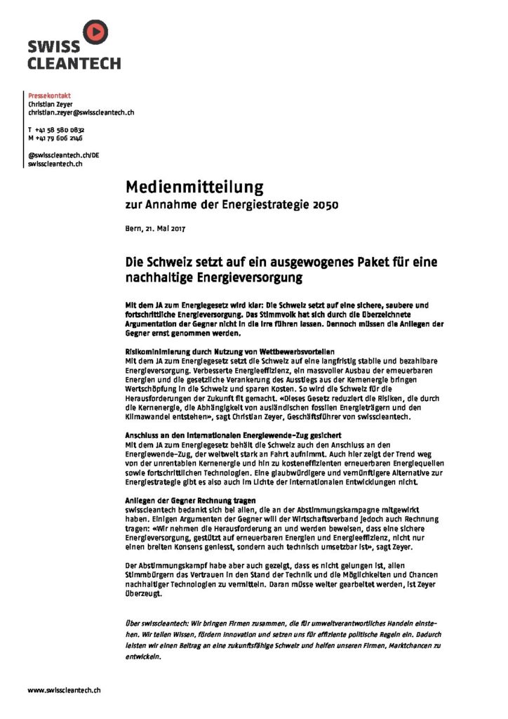 swisscleantech bedankt sich bei allen, die an der Abstimmungskampagne mitgewirkt haben. Einigen Argumenten der Gegner will der Wirtschaftsverband jedoch auch Rechnung tragen: «Wir nehmen die Herausforderung an und werden beweisen, dass eine sichere Energieversorgung, gestützt auf erneuerbaren Energien und Energieeffizienz, nicht nur einen breiten Konsens geniesst, sondern auch technisch umsetzbar ist», sagt Zeyer.