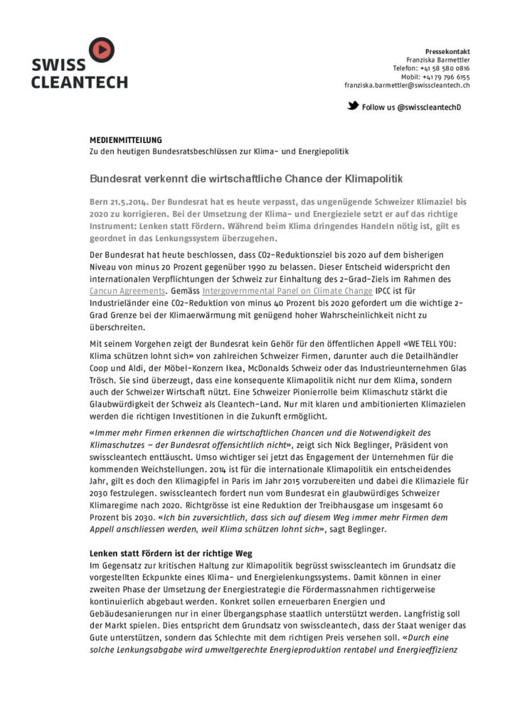 Mit seinem Vorgehen zeigt der Bundesrat kein Gehör für den öffentlichen Appell «WE TELL YOU: Klima schützen lohnt sich» von zahlreichen Schweizer Firmen, darunter auch die Detailhändler Coop und Aldi, der Möbel-Konzern Ikea, McDonalds Schweiz oder das Industrieunternehmen Glas Trösch. Sie sind überzeugt, dass eine konsequente Klimapolitik nicht nur dem Klima, sondern auch der Schweizer Wirtschaft nützt. Eine Schweizer Pionierrolle beim Klimaschutz stärkt die Glaubwürdigkeit der Schweiz als Cleantech-Land. Nur mit klaren und ambitionierten Klimazielen werden die richtigen Investitionen in die Zukunft ermöglicht.