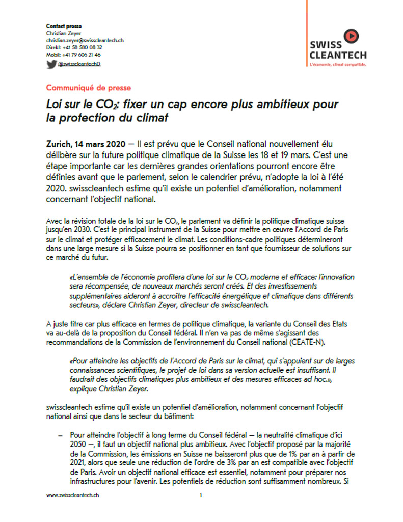 Avec la révision totale de la loi sur le CO2, le parlement va définir la politique climatique suisse jusqu’en 2030. C’est le principal instrument de la Suisse pour mettre en œuvre l’Accord de Paris sur le climat et protéger efficacement le climat.Les conditions-cadre politiques détermineront dans une large mesure si la Suisse pourra se positionner en tant que fournisseur de solutions sur ce marché du futur.