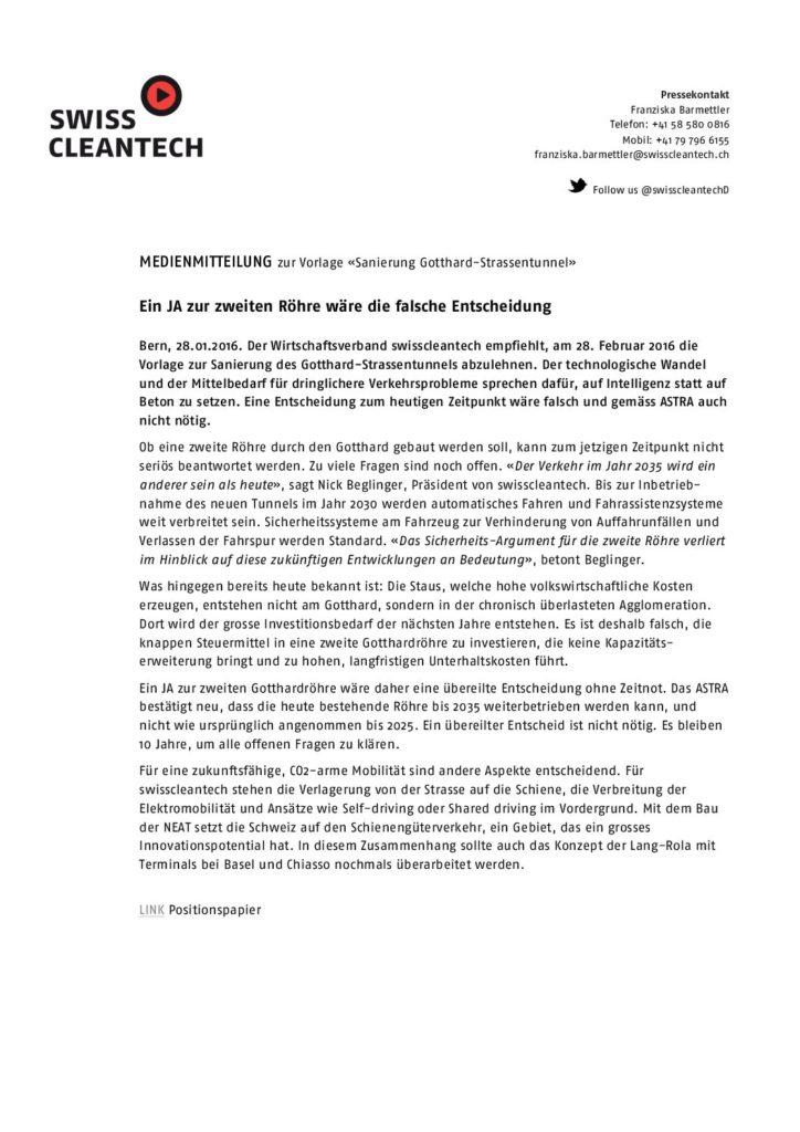 Pour assurer à l’avenir une mobilité pauvre en CO2, d’autres aspects sont décisifs. swisscleantech est d’avis que le transfert du trafic de la route au rail, la diffusion de la mobilité électrique et les débuts des voitures autonomes ou du covoiturage ont la priorité. Avec la construction de la NLFA, la Suisse mise sur le trafic de marchandises ferroviaire, un domaine qui dispose d’un riche potentiel d’innovation. Dans ce contexte, le concept de la chaussée roulante longue et ses terminaux à Bâle et à Chiasso doit être retravaillé encore une fois.