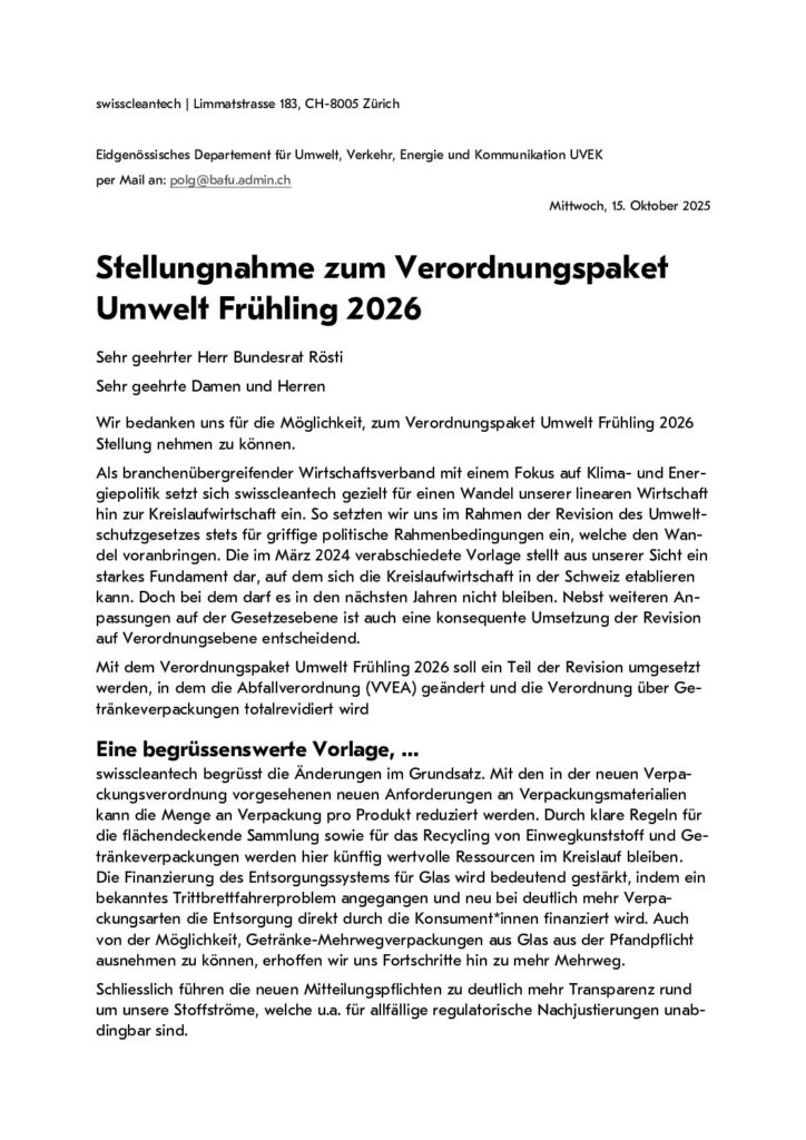 Die geplanten Anpassungen der Abfall- und Verpackungsverordnung werden wesentlich zur Kreislaufwirtschaft in der Schweiz beitragen. Die Verpackungsmenge pro Produkt wird mit der Verordnung sinken, während verbindliche Regeln für Sammlung und Recycling von Einwegkunststoffen und Getränkekartons endlich die Basis für funktionierende Stoffkreisläufe schaffen.